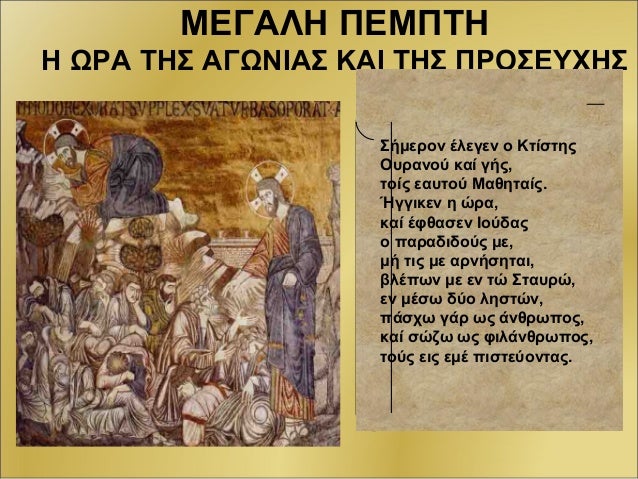 Μεγαλη Πεμπτη / ΜΕΓΑΛΗ ΠΕΜΠΤΗ ΕΣΠΕΡΑΣ - ΑΚΟΛΟΥΘΙΑ ΤΩΝ ΠΑΘΩΝ - YouTube. Την ημέρα αυτή ξεκινούν οι προετοιμασίες στα ελληνικά σπίτια για τον εορτασμό της ανάστασης. Κατά το ευαγγέλιο του ματθαίου. Οι καμπάνες χτυπούν πένθιμα σε όλη τη χώρα, σε κάθε ορθόδοξη εκκλησία. Η μεγάλη πέμπτη, η ιερή μέρα κατά την οποία εορτάζεται ο μυστικός δείπνος του ιησού χριστού με τους 12 αποστόλους. Ὅτε οἱ ἔνδοξοι μαθηταί, ἐν τῷ νιπτῆρι τοῦ δείπνου ἐφωτίζοντο, τότε ἰούδας ὁ δυσσεβής, φιλαργυρίαν νοσήσας ἐσκοτίζετο, καὶ ἀνόμοις κριταῖς, σὲ τὸν δίκαιον κριτὴν παραδίδωσι.